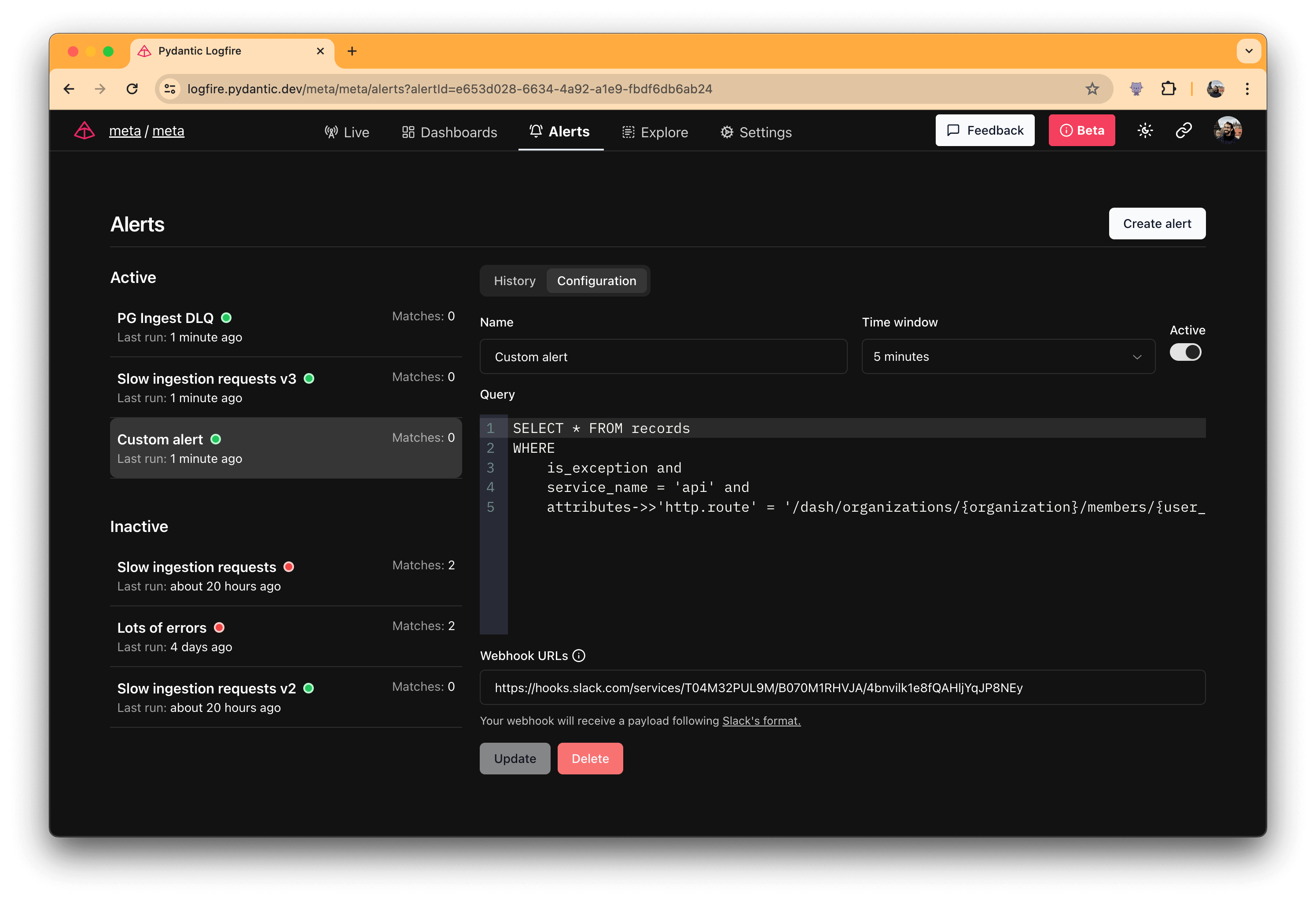 The Webhook URL field is where you can specify a URL to which the alert will send a POST request when triggered. For now, Logfire alerts only send the requests in Slack format.