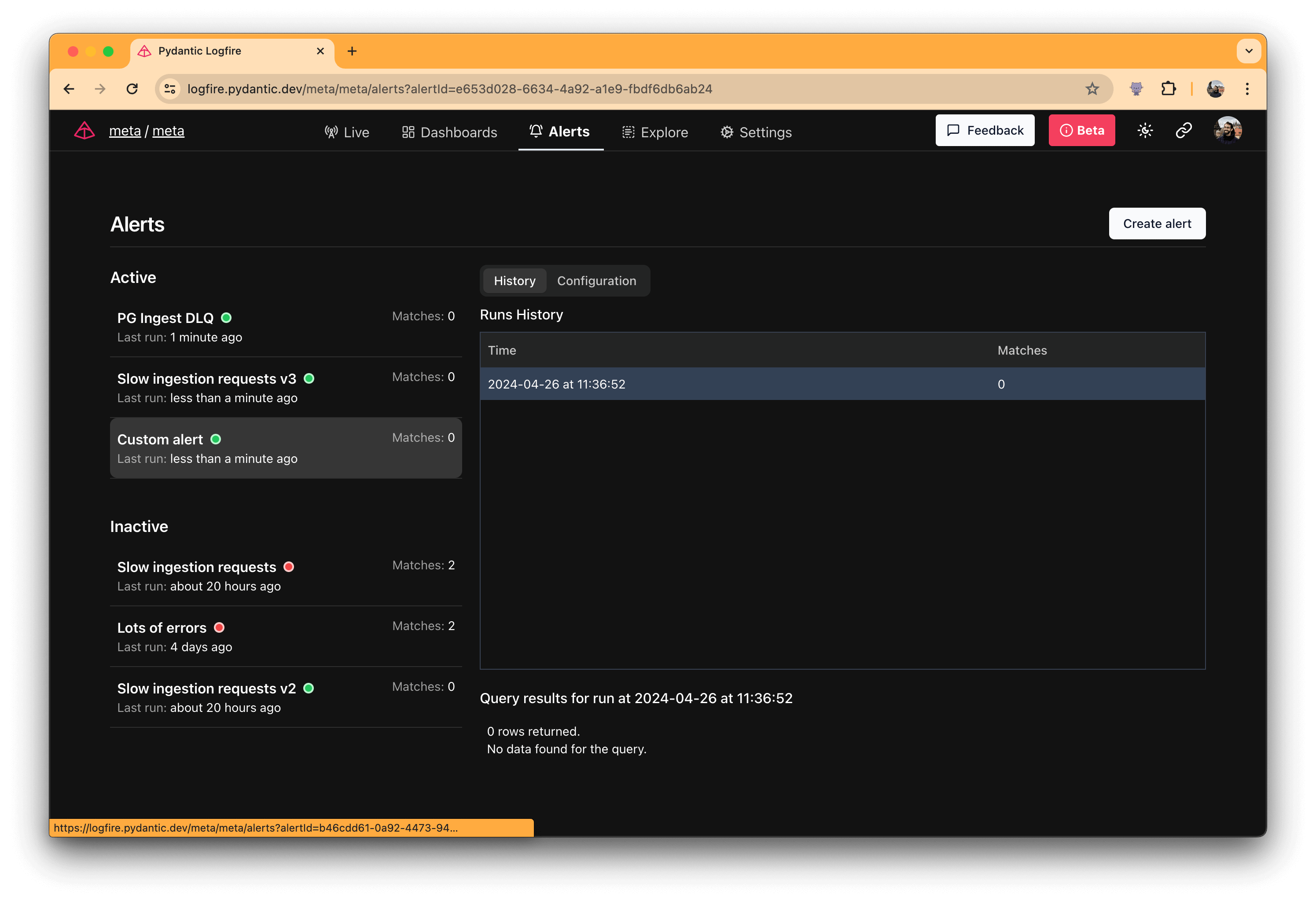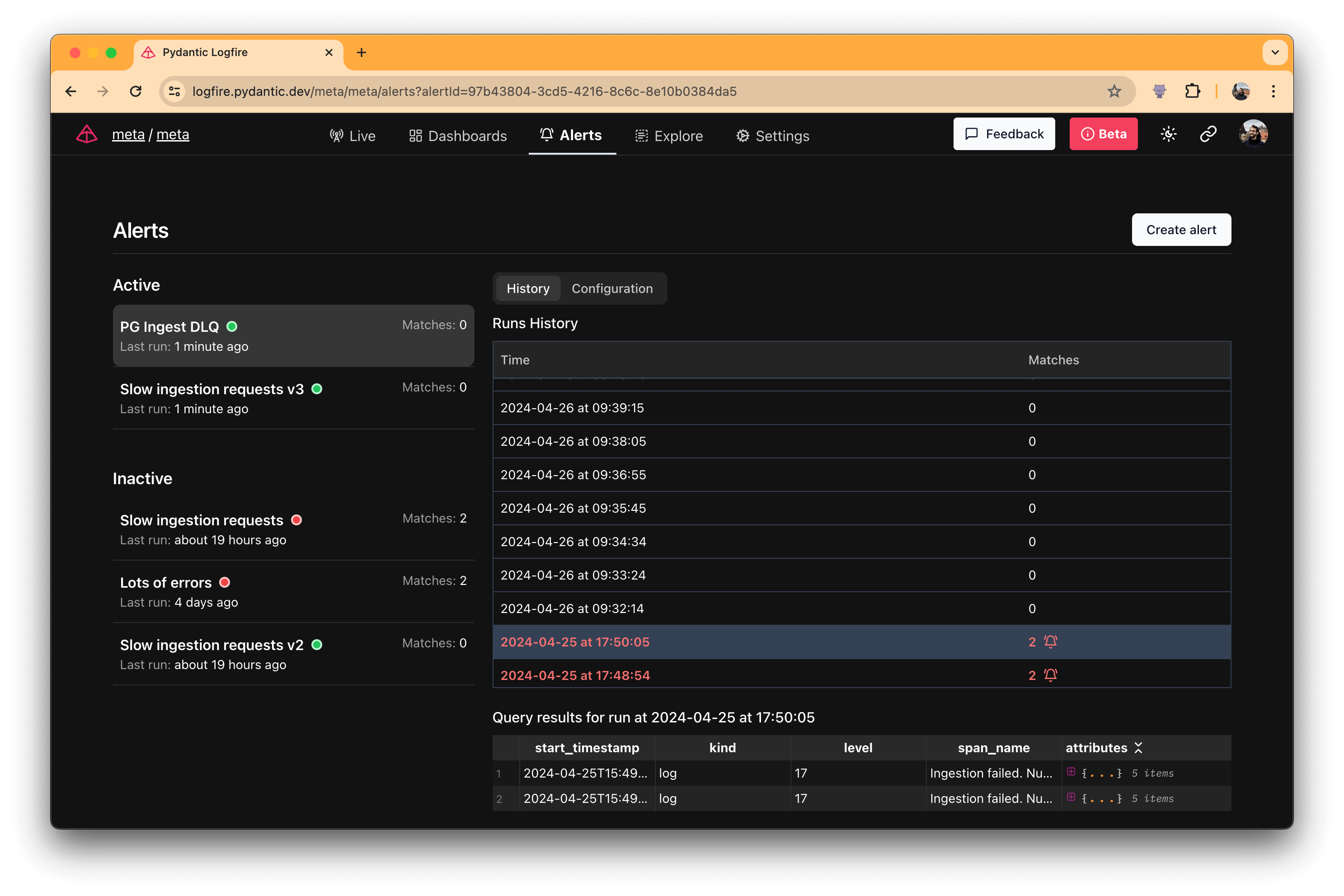 With Logfire, you can set up alerts to notify you when certain conditions are met.